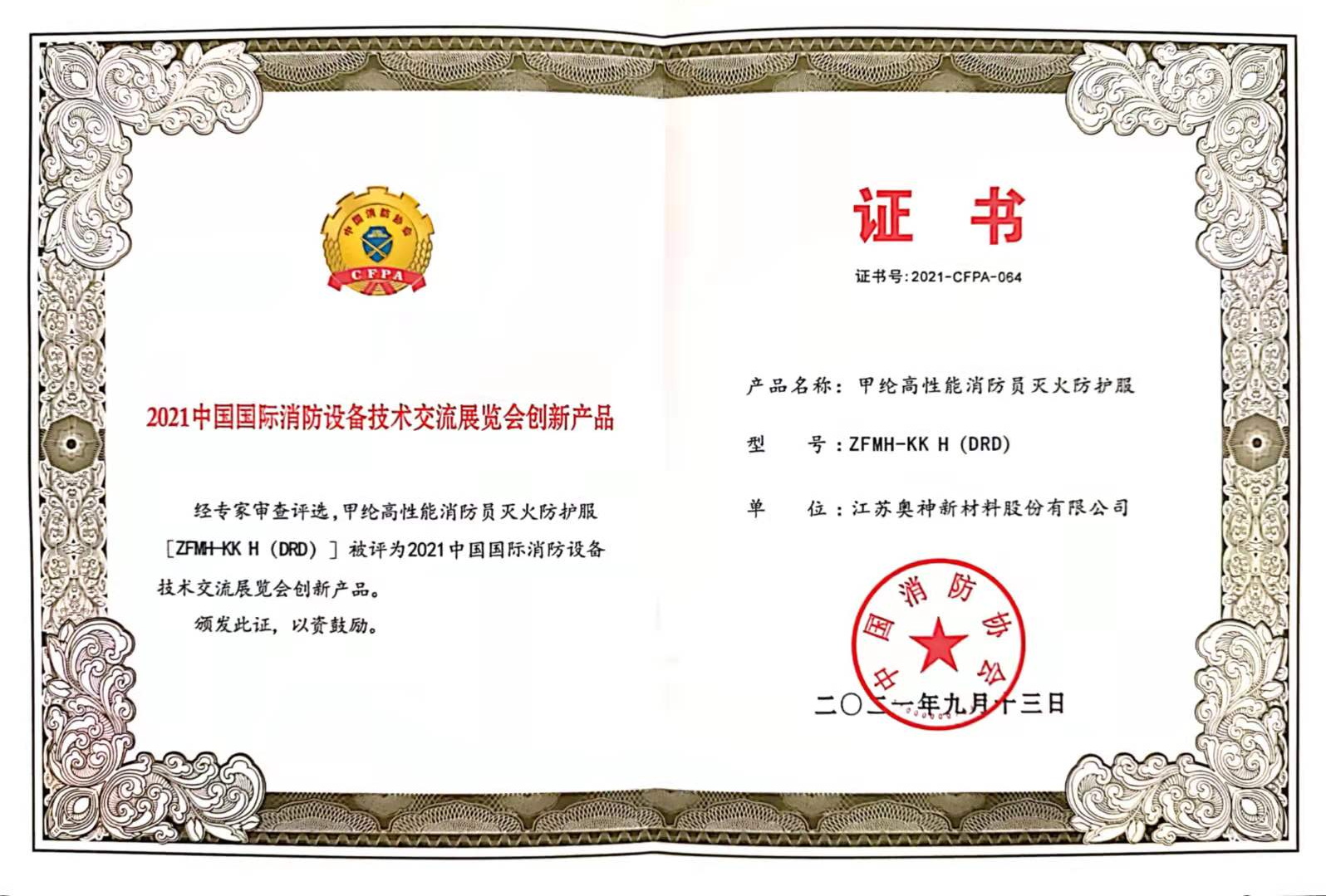 2021年10月12日,在北京召開的第十九屆中國國際消防設(shè)備技術(shù)交流展覽會上,江蘇奧神新材料股份有限公司研發(fā)的“甲綸高性能消防員滅火防護服”憑借優(yōu)異的性能獲得“2021中國國際消防設(shè)備技術(shù)交流展覽會創(chuàng)新產(chǎn)品”榮譽稱號。此次參與評選的都是來自全國各地實力雄厚的消防領(lǐng)域企業(yè),經(jīng)歷層層評選,甲綸高性能消防員滅火防護服脫穎而出,受到專家的一致好評。