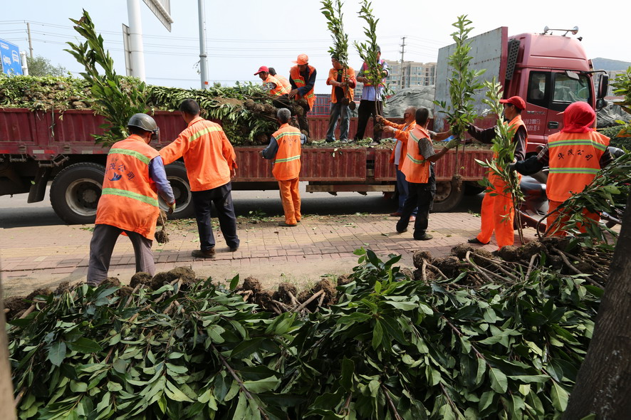 新光路鐵路橋至港城大道段南側(cè)綠化帶,因為人為踩踏、車輛碾壓導(dǎo)致綠化斑禿損壞嚴(yán)重,為盡快恢復(fù)綠化原貌,改善市容市貌。818日,裕升、裕欣養(yǎng)護(hù)公司組織80多名綠化工,從早上6點一直干到下午6點,卸苗、運苗、挖坑、插苗,烈日酷暑下奮戰(zhàn)一整天,中午在樹陰下吃點盒飯,喝點礦泉水,繼續(xù)工作,橘黃色工作被汗水浸透、被烈日烤干,這樣有好幾個來回。“今天我們要在這片綠化補(bǔ)植紅葉石楠、金森女貞等模紋小苗1萬余株,紅葉石楠球等灌木110株,有效改善該路段綠化植被,提升城市形象,我們還要在黃海續(xù)道補(bǔ)植草坪近30000平方,在這條1000多米長的路段,有車輛維修點50多家,車輛出入,對路邊綠化帶傷害非常大,這一路段也是環(huán)衛(wèi)整治長期存在的‘老大難’,這次,在開發(fā)區(qū)行政執(zhí)法部門的配合下,我們要重新種植草坪,對這一‘老大難’路段植被進(jìn)行恢復(fù),另外德蘭南路、東路補(bǔ)植苗木近80萬元的綠化工程也已開工上土整土,接著要栽苗,根據(jù)開發(fā)區(qū)創(chuàng)衛(wèi)部署要求,上述這些事情必須在8月底完成,所以說時間相當(dāng)緊,職工們都冒著高溫,加班加點搶進(jìn)度。”公司副總經(jīng)理郁宏峰說。