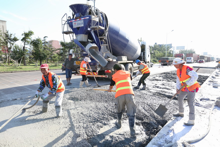在大港路“新光路至零公里”路段,筆者在水泥路上看到一塊塊被切割成方方正正的凹面,四周都架好防護(hù)欄等安全防護(hù)設(shè)施,在華東城北門偏東不遠(yuǎn)處,一臺挖掘機(jī)的鏟斗被換上沖擊破碎錘,正在一大塊破損的水泥路面沖擊破碎作業(yè),“嗒嗒嗒”的沖擊聲十分震耳。在與現(xiàn)場作業(yè)的盛達(dá)市政公司市政維修項目部副主任史如勤交流中得知,該路段是附近集團(tuán)箱基站進(jìn)出港口集裝箱車輛的重要通道,每天有好幾百輛集裝箱車輛進(jìn)出,水泥路面不堪重負(fù),損壞比較嚴(yán)重,根據(jù)開發(fā)區(qū)創(chuàng)衛(wèi)工作要求,由他們對該路段破損處進(jìn)行局面分割維修,整個路段維修面積達(dá)到5000多平方,為保證道路使用通行,采取半幅維修、邊破碎邊澆灌的方式,保證施工進(jìn)度,現(xiàn)正在維修北側(cè)路面,整個路面維修計劃在8月底完成。“因為創(chuàng)衛(wèi),我們下一步還要對轄區(qū)內(nèi)的破損、歪到的路牙石進(jìn)行維修扶正,242路段瀝青破損路面維護(hù),還要開通四處道口,而現(xiàn)在事多人少,人手比較緊張,我們周六周日都沒有休息,就是想把創(chuàng)衛(wèi)工作任務(wù)一項一項地及時完成,決不能拖創(chuàng)衛(wèi)工作后腿。”他邊說邊用肩上的毛巾擦著額頭上的汗水。