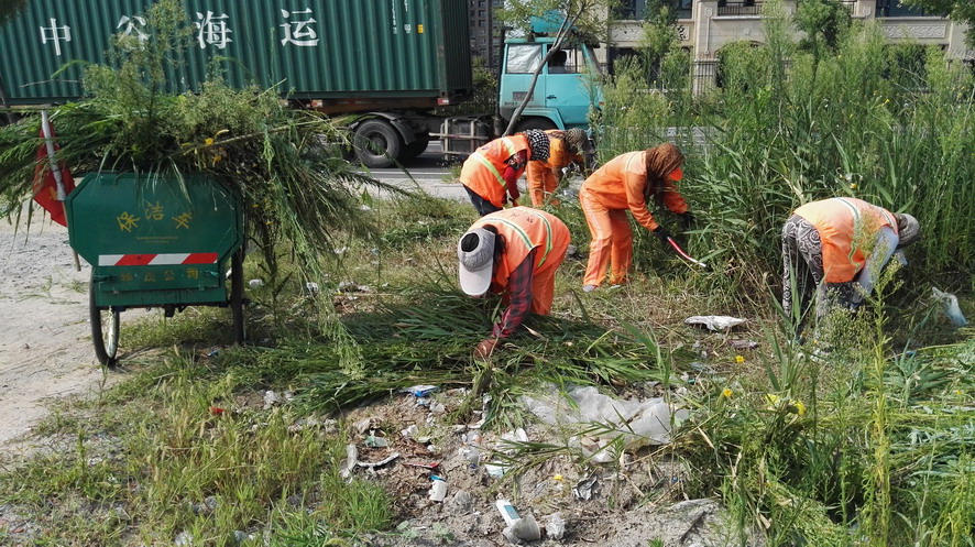 在昌圩湖環(huán)湖路南側(cè)一處公共廁所處,裕升養(yǎng)護(hù)公司20多名環(huán)衛(wèi)保潔工人正在清理公廁周邊的雜草、建筑垃圾,有的在割草、有的在搬磚、有的在推車,一個個汗流浹背,忙得不亦樂乎。正在現(xiàn)場忙碌的保潔大隊長劉保軍對筆者說:“這一塊段還沒有交給我們養(yǎng)護(hù),一直無人管理,雜草叢生,成為建筑、裝修垃圾的堆放地,根據(jù)開發(fā)區(qū)創(chuàng)衛(wèi)環(huán)境衛(wèi)生無死角要求和華茂公司生產(chǎn)技術(shù)部門指令,我們裕升養(yǎng)護(hù)公司承擔(dān)這一區(qū)域環(huán)境衛(wèi)生突擊整治任務(wù),從綠化保潔班組抽調(diào)20多人來搞突擊,大家面對天氣炎熱、工作量大、清理困難等因素,發(fā)揚(yáng)不怕吃苦、敢打硬仗的華茂精神,奮戰(zhàn)在突擊現(xiàn)場,每個人都汗流不止,工作服全被汗水浸透,昨天我們已在這里整整干了一天,由于垃圾量大、雜草面積大,我們動用了裝載機(jī)等機(jī)械設(shè)備,運雜草的三輪車跑近百趟,清理建筑、裝修等垃圾數(shù)十噸。估計今天下午能夠全部結(jié)束。”