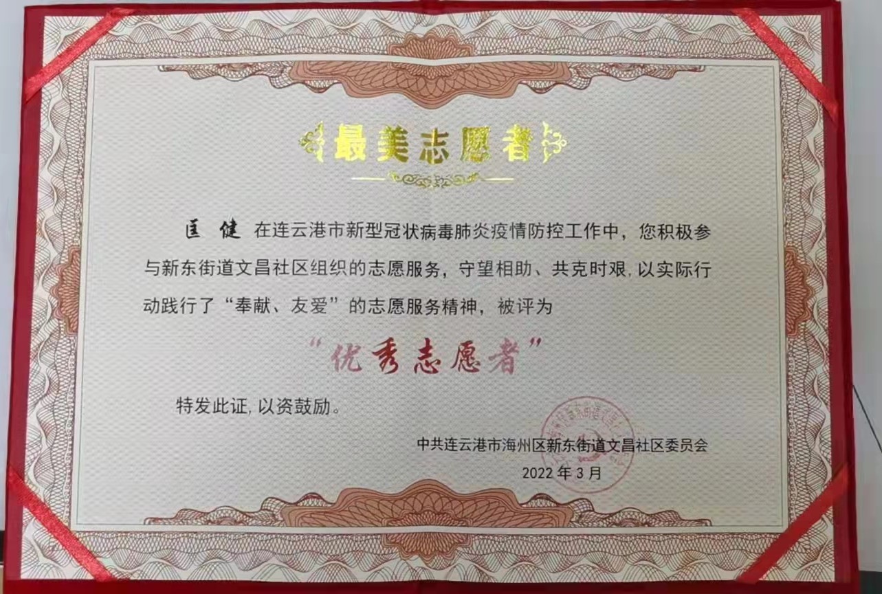 近日,公司黨員匡健、王長(zhǎng)春分別被新東街道文昌社區(qū)、路南街道朝陽(yáng)社區(qū)授予“最美志愿者”和“抗疫先鋒志愿者”。感謝他們?cè)谝咔榉揽仄陂g舍小家顧大家,同舟共濟(jì)戰(zhàn)疫情、共克時(shí)艱同擔(dān)當(dāng),守護(hù)居民群眾的健康安全,為打贏疫情防控阻擊戰(zhàn)發(fā)揮了積極作用。