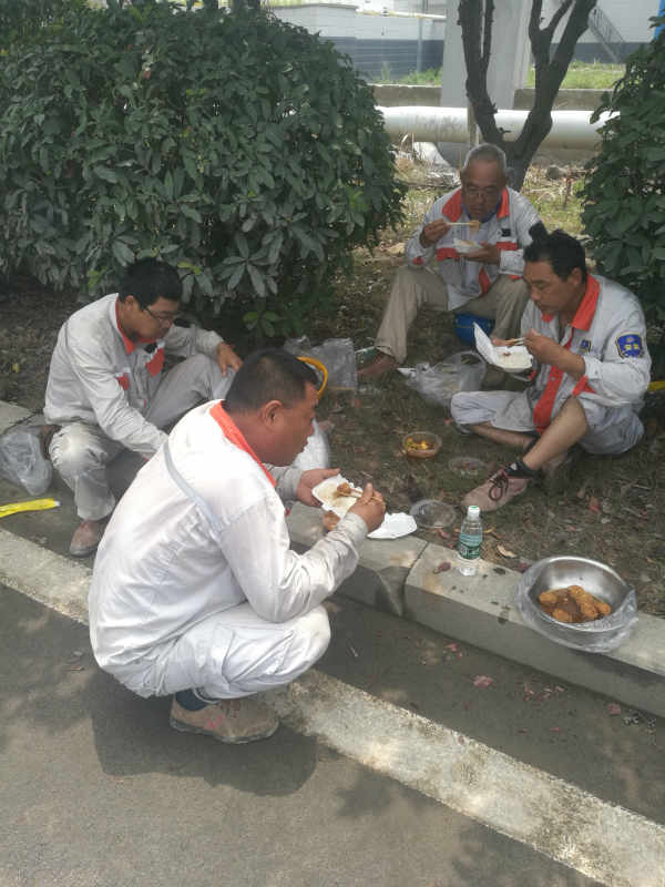 6月28日,在炎炎烈日之中,在地面溫度達40多度的中午時間,位于池月路富佳攪拌站的環(huán)網(wǎng)柜旁,滿頭大汗的于廣兵、孫忠清、孫正宏、周玉民等顧不上休息,正盤坐在樹蔭下對付著吃著快餐,與接下來的搶修工作爭搶時間。隨后這一畫面被筆者用手機捕捉下來。筆者相信,這不僅僅是一張堅守在一線的工人們高溫下吃飯的照片,更是一張當前乃至今后一個時期,臺北供電所員工們在“高質(zhì)發(fā)展、后發(fā)先至”新形勢下“愛企奉獻,愛崗敬業(yè)”的真實寫照。