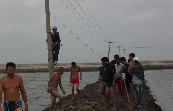 8月2日21時(shí)30分,“達(dá)維”在鹽城陳家港鎮(zhèn)登陸,帶來狂風(fēng)暴雨。所轄供電范圍比鄰陳家港鎮(zhèn),臺風(fēng)造成電力設(shè)施損壞,多條10KV線路停電。該所啟動重大氣象災(zāi)害應(yīng)急預(yù)案,全所職工在崗待命搶修, 8月3日凌晨3時(shí)30分有全部到崗工作。4時(shí),職工分頭對線路進(jìn)行巡視檢查,在第一時(shí)間發(fā)現(xiàn)故障點(diǎn),以便搶修。該所主要領(lǐng)導(dǎo)主動與重要客戶聯(lián)系,及時(shí)掌握情況,組織人員搶修。廣大搶修職工不怕困難,不怕疲勞連續(xù)作戰(zhàn),盡快恢復(fù)和保證生產(chǎn)生活用電,發(fā)揮了供電人特別能戰(zhàn)斗的精神。由于電桿倒在水中,給立桿帶來了困難,大家主動脫去衣服,跳入到半腰身的水中搶修,有的解線,有的打拉線,個個干得一身汗,一身泥。