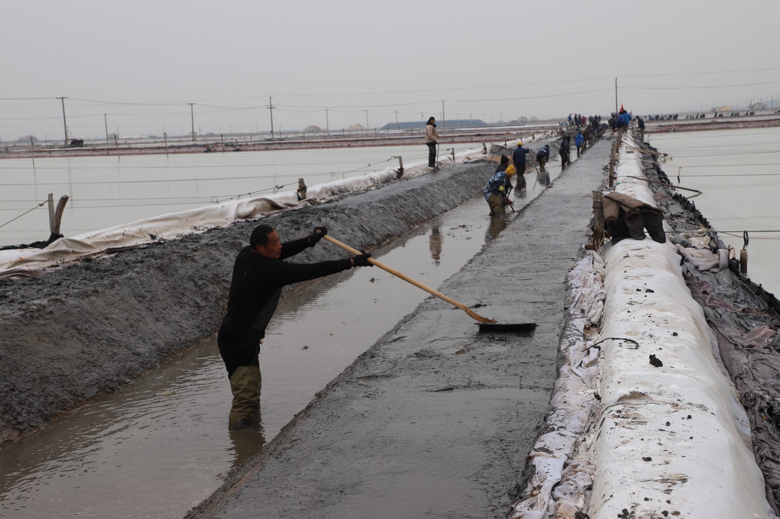 在新河制鹽分公司鹽田地頭的冬準(zhǔn)會戰(zhàn)現(xiàn)場,人頭攢動,工人們正動作嫻熟的進(jìn)行澆水、翻泥、踩實(shí)、做埝、整平……,鹽工們?nèi)幭冗M(jìn)位,手腳不停的揮鍬挖泥,呈現(xiàn)出你追我趕、比肩發(fā)力的勞動場景。一條條溝道改造、格堰修整等亮化灘場文明建設(shè)煥然一新,一幅幅“人勤春早”的美麗畫卷徐徐展開。