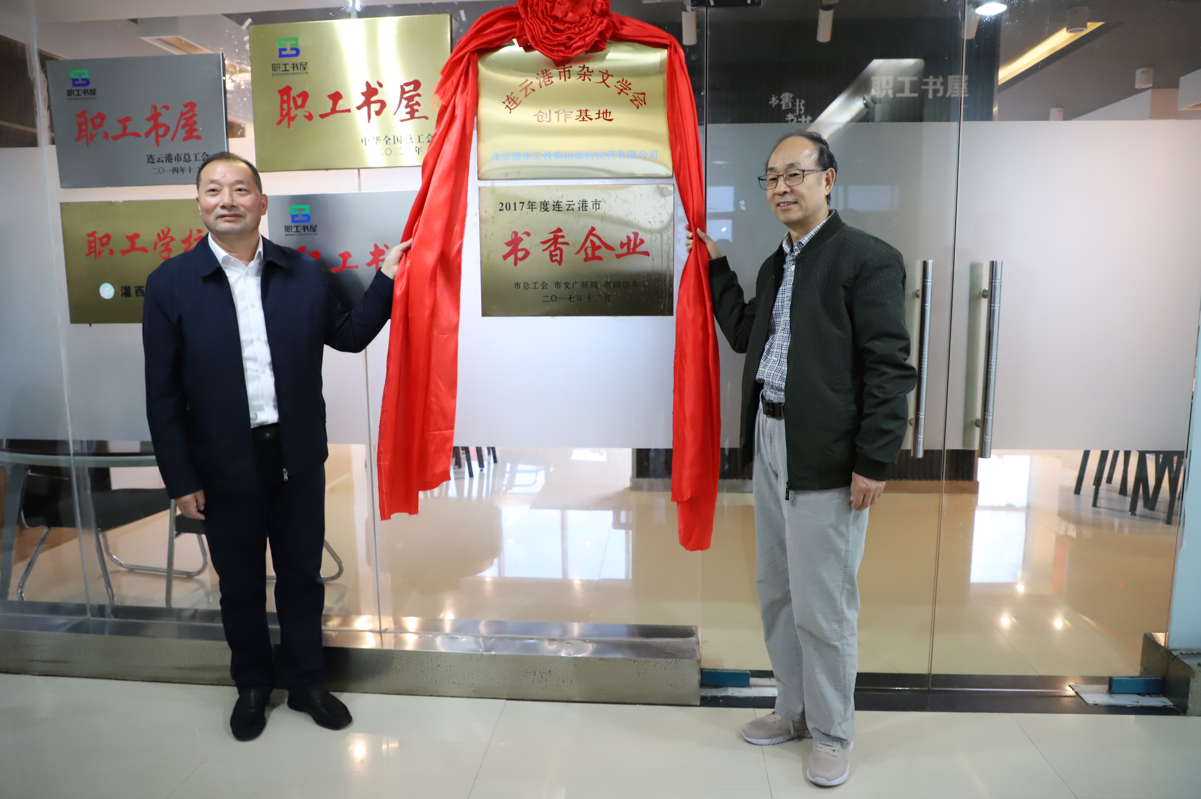 11月3日,連云港市雜文學(xué)會創(chuàng)作基地掛牌儀式在灌西投資公司職工書屋舉行,市雜文學(xué)會會長李正冬一行為灌西公司授牌,公司黨委書記、董事長、總經(jīng)理李國文,黨委副書記、工會主席王宏等參加掛牌儀式。