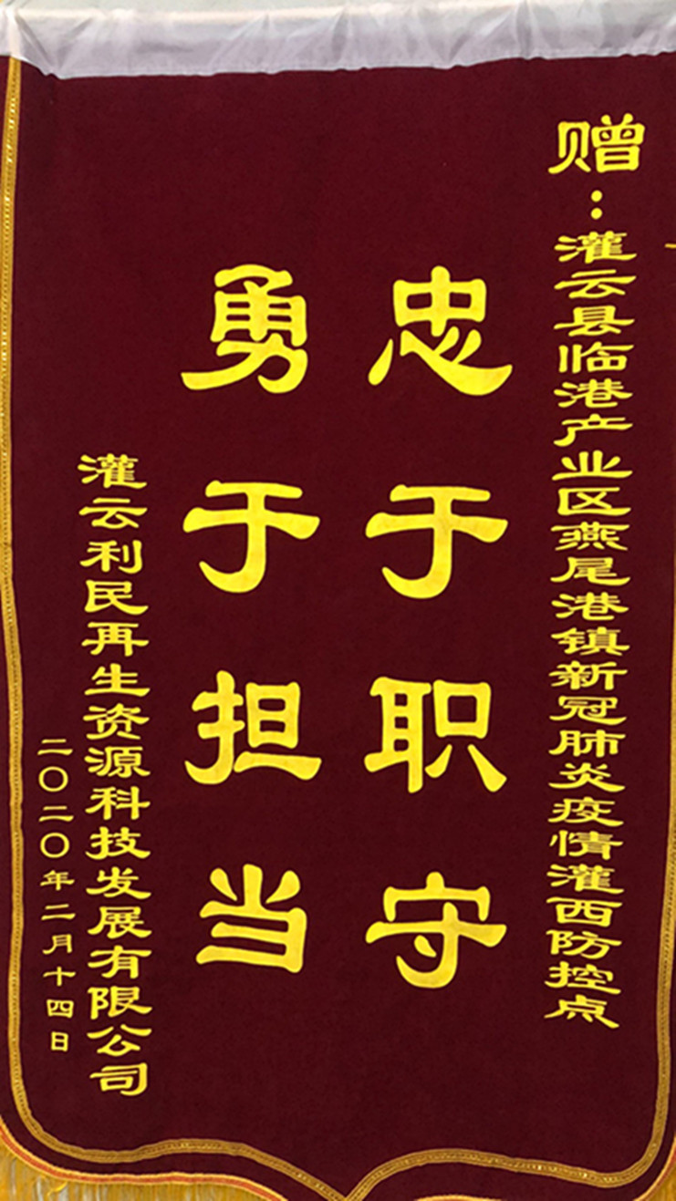 “非常感謝你們對我們?nèi)夜镜氖刈o(hù),為我們廣大職工筑牢了一道防疫情的銅墻鐵壁,你們辛苦了!”近日,連云港臨海新材、灌云利民再生資源、江蘇沙英喜三家公司分別為新冠肺炎疫情灌西防控點(diǎn)值守人員送來三面錦旗,感謝灌西投資公司值守人員在疫情期間為疫情防控工作作出的貢獻(xiàn)。