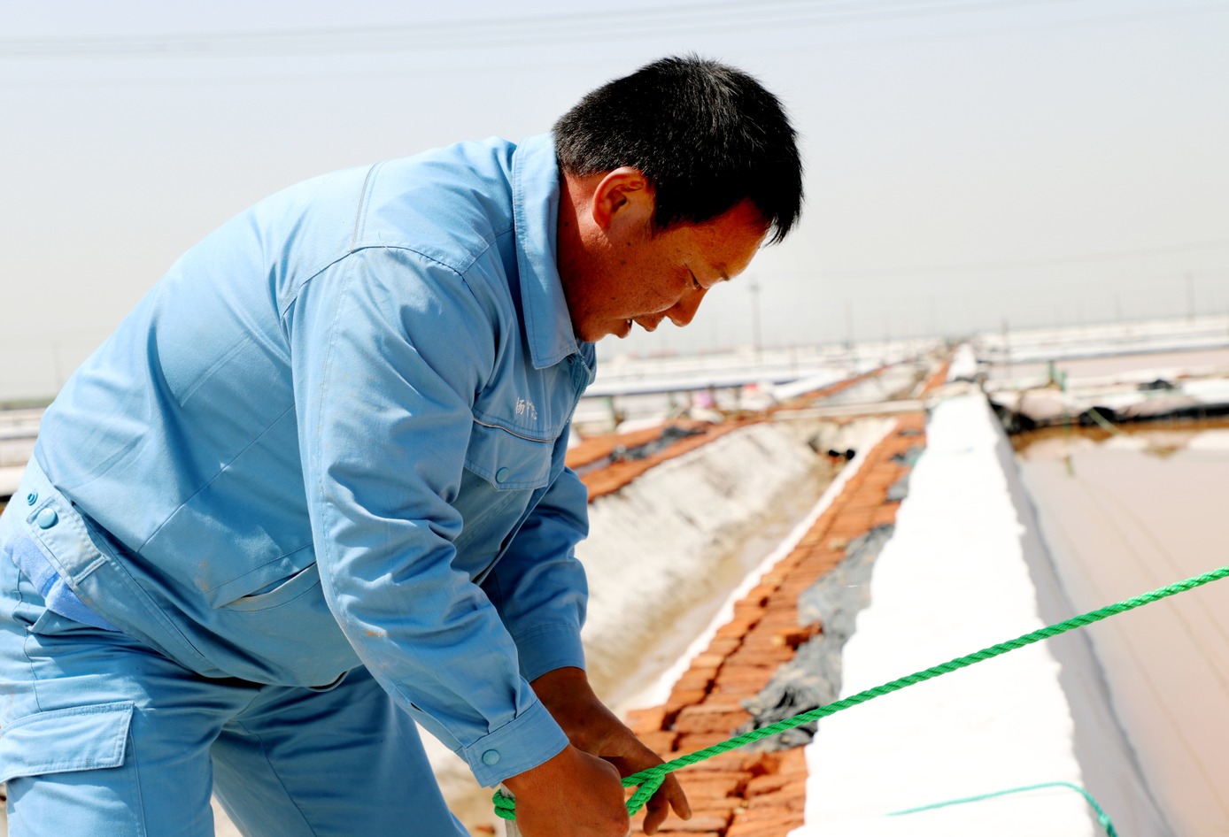 在新河的八班,員工有的在補塑料布,有的在疏通排水溝道,整理繩索,也是忙的熱火朝天。為了抓好二季度工作,八班以生產(chǎn)合格原料食用海鹽為目標(biāo),緊抓有利天時,進一步創(chuàng)新海礦鹵勾兌制鹽工藝,細化工作措施,責(zé)任到人,著力提升原鹽質(zhì)量和產(chǎn)量,目前已生產(chǎn)海水鹽4000噸。
