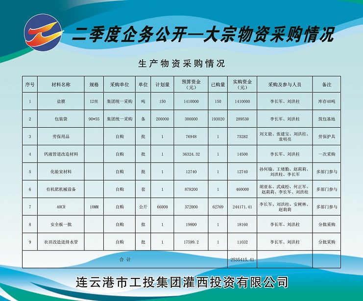 1、由集團(tuán)公司集中采購塑料布(鹽膜)150噸(由工投集團(tuán)運營監(jiān)管部在總部組織招標(biāo))、包裝袋20萬條,實購金額計169.953萬元。