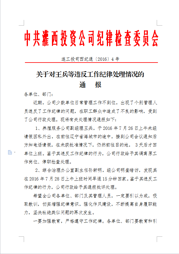 關(guān)于對王兵等違反工作紀(jì)律處理情況的通報