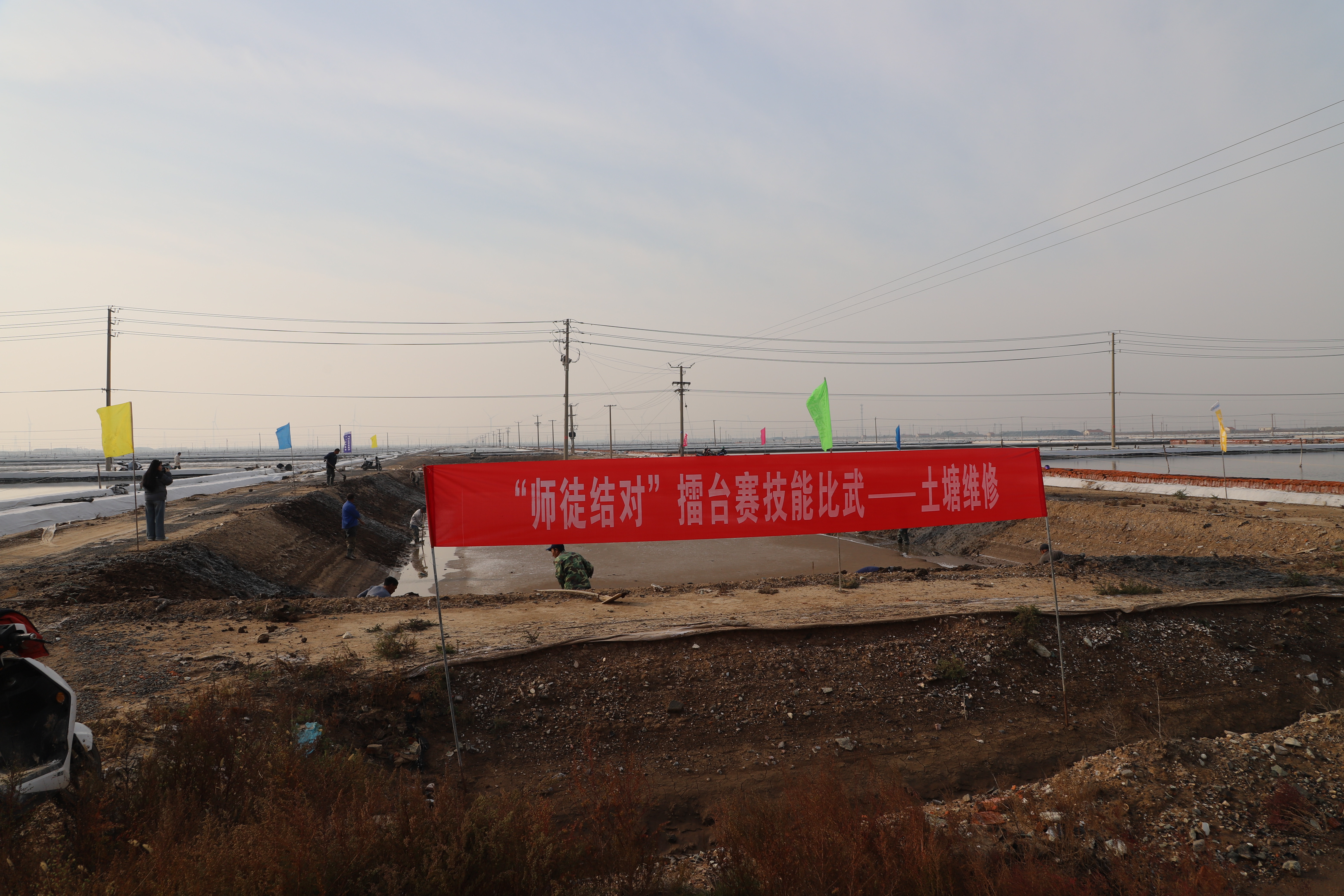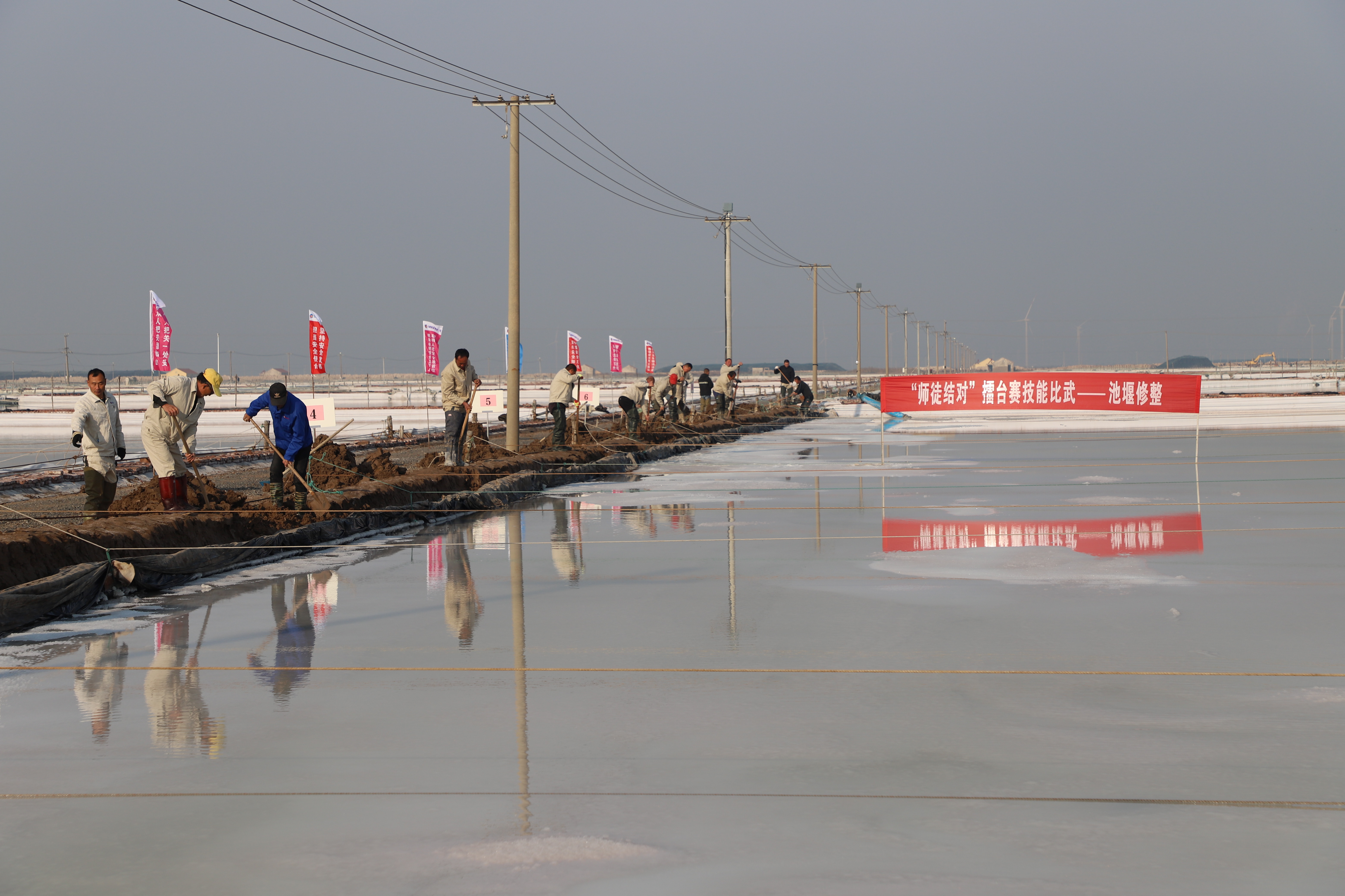 寒冬時(shí)節(jié),暖陽之下,鹽廩之旁,曬得黝黑的鹽場(chǎng)產(chǎn)業(yè)工人們按照競(jìng)賽的考核標(biāo)準(zhǔn),做熟泥、打堰墻、做堰頂,護(hù)埝頂、夯埝坡、清塘底,由此,見證了一場(chǎng)技能比拼的盛會(huì)。