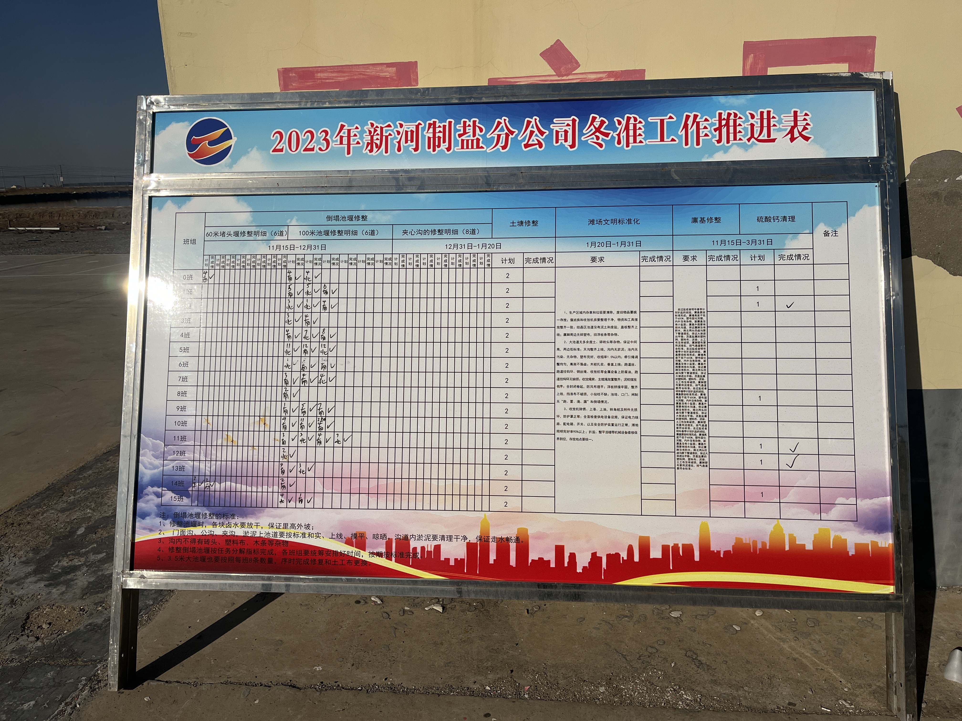 冬季是日曬制鹽收儲鹵水、扒土塘、整理灘場文明的最佳時期,也是為2024年工作起好頭、邁好步的關(guān)鍵時期,自冬準(zhǔn)工作開展以來,新河制鹽分公司制定冬準(zhǔn)工作推進(jìn)表,掛圖作戰(zhàn)按時推進(jìn)冬準(zhǔn)進(jìn)度。