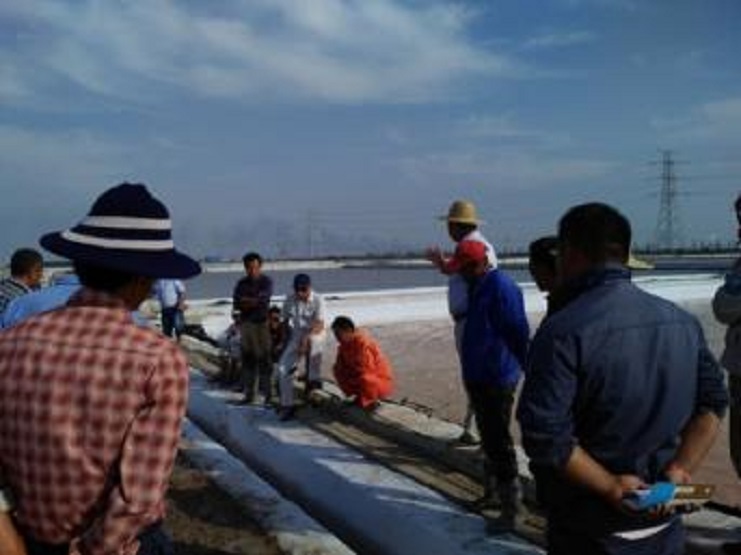 該分公司一班人帶著十六名班長,到新河零班做加鹵“天溝”工作現(xiàn)場。剛到目的地,站在打好的溝頭,一眼望去,二條溝口線筆直,和熟捯實(shí)的粘埝泥輕而易舉承載著人的重量。此條加鹵“天溝”嚴(yán)格按日曬制鹽公司規(guī)格標(biāo)準(zhǔn)而建,溝長約210米,上口寬55cm,下口寬30cm,溝深45cm,溝底坡勢順沿三排到頭排由淺至深。做好的一條加鹵溝, 可以為六塊結(jié)晶池扒鹽期間分別添加鹵水,減少洗鹽鹵水進(jìn)其它池塊的二次污染。