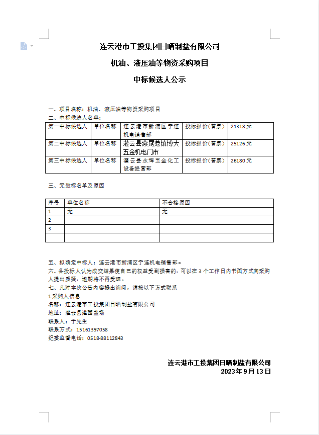 連云港市工投集團(tuán)日曬制鹽有限公司 機(jī)油、液壓油等物資采購項目中標(biāo)候選人公示