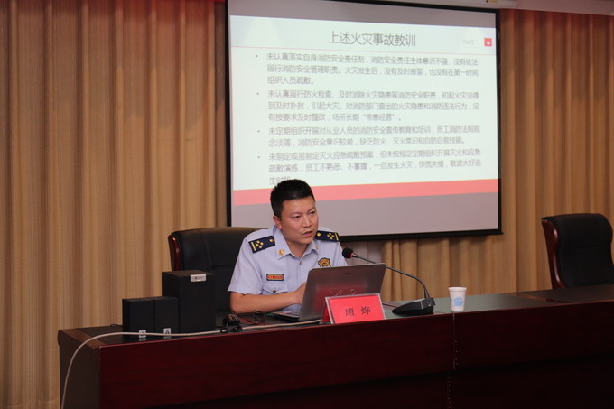 為規(guī)范消防安全管理,提高公司干部職工消防安全意識和火災(zāi)應(yīng)急處置能力,7月7日,我公司邀請連云區(qū)消防隊副隊長唐燁,在三樓會議室開展消防安全知識培訓(xùn)。公司董事長、黨委書記、總經(jīng)理朱桂玉,黨委副書記、工會主席曹開明,副總經(jīng)理何啟明,總經(jīng)理助理李忠祥,各單位、車間、部室人員參加了培訓(xùn)。