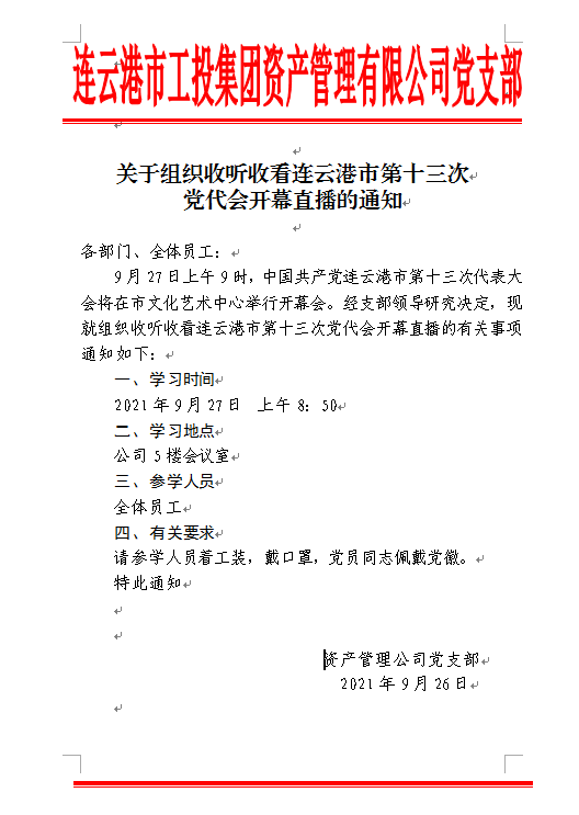 關(guān)于組織收聽收看連云港市第十三次黨代會(huì)開幕直播的通知