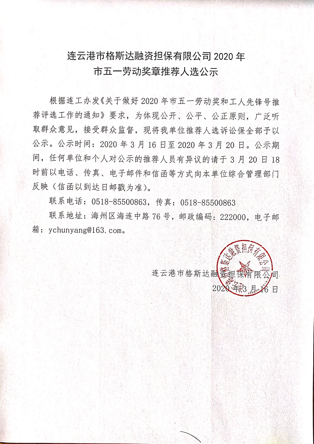 連云港市格斯達(dá)融資擔(dān)保有限公司2020年市五一勞動獎?wù)峦扑]人選公示