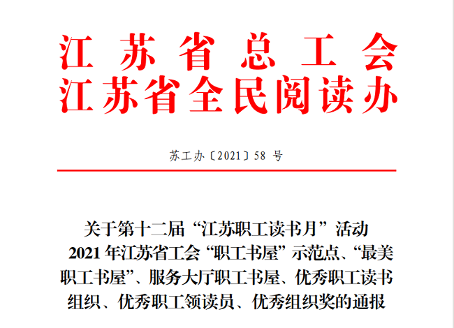 近日,江蘇省總工會(huì)、江蘇省全民閱讀辦聯(lián)合下發(fā)《關(guān)于第十二屆“江蘇職工讀書月”活動(dòng)通報(bào)》(蘇工辦【2021】58號(hào))文中,我公司職工書屋獲評(píng)2021年度江蘇省工會(huì)“職工書屋”示范點(diǎn),同時(shí)獲贈(zèng)圖書近200冊(cè)。
