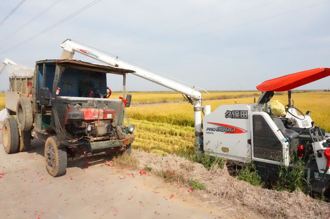 10月25日,天氣晴好。四臺收割機伴隨著喜慶的爆竹聲陸續(xù)開進稻田,拉開了大新農(nóng)場萬畝稻田開鐮序幕。黨委委員、副總經(jīng)理周緒祥在現(xiàn)場查看指揮。