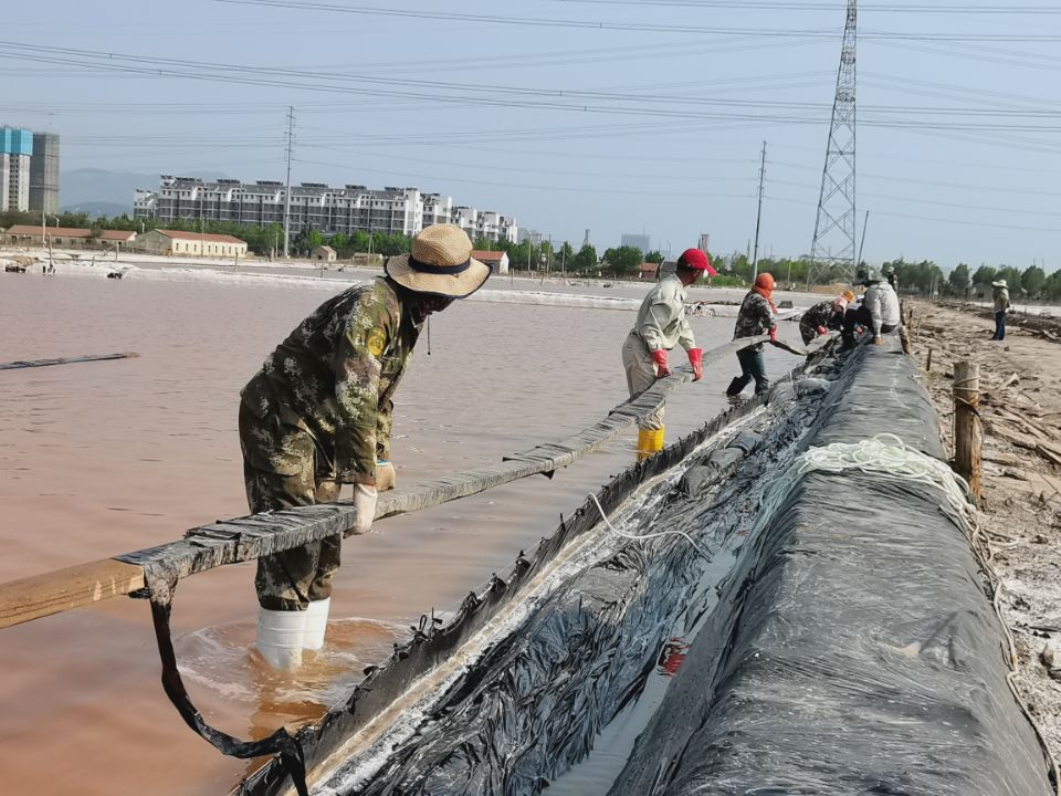 礦鹽生產(chǎn)班組提前謀劃原鹽集運(yùn)前的準(zhǔn)備工作。2022年秋扒鹽已經(jīng)順利落下帷幕,工人們利用收鹽后的空隙對(duì)鹽池板進(jìn)行修整、整理收放系統(tǒng)以及將扒鹽機(jī)械進(jìn)行保養(yǎng)入庫(kù)等等。同時(shí),修整運(yùn)鹽主干道,地基較軟處以鋼板鋪墊,確保運(yùn)鹽車輛安全通過。排查廩基周圍高低壓線路,在作業(yè)的同時(shí)堅(jiān)守安全生產(chǎn)底線。等待天氣轉(zhuǎn)好,將立即進(jìn)行原鹽集運(yùn)。