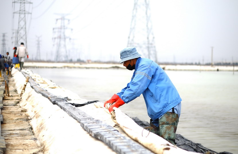 ? ? ? ??首先來到海州灣公司大浦班組。這里是公司礦鹵復(fù)產(chǎn)工作重點(diǎn)班組,職工們正在整理結(jié)晶池、搶修塑苫布。據(jù)海州灣公司負(fù)責(zé)人劉天義現(xiàn)場(chǎng)介紹,由于前期審批、采購等原因,加之突發(fā)的新冠肺炎疫情,結(jié)晶池塑苫布沒能及時(shí)更新,預(yù)報(bào)25日有明顯降雨過程,海州灣廣大職工因地制宜,收舊利廢,積極備戰(zhàn)大雨天時(shí)。