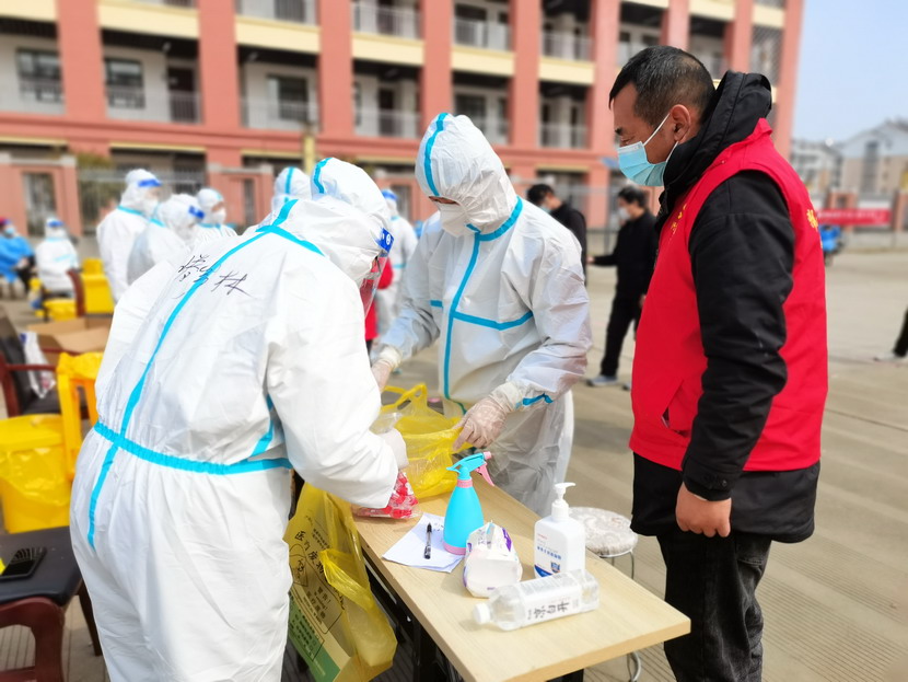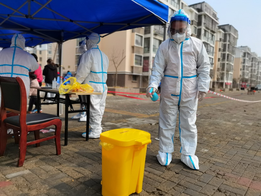 清晨6點30分,1號檢測點,李明同志在檢查物資,“大白”服裝4套、“小藍”服裝6套、棉簽600根……;2號檢測點,于洪亮在將物資上桌,病毒核酸檢測試管、棉簽、消毒液,“還缺少一瓶酒精,我立即反饋給社區(qū),請社區(qū)抓緊安排送來”;4號檢測點,蘇玲、秦黎明正在互相幫忙穿好防護服,“秦姐,這個防護面罩里外有兩層薄膜,我給你撕掉,這樣就不會有霧氣了”,“嗯嗯,你這個拉鏈得拉到頂,我們自己也一定要做好防護”秦黎明溫柔的說;5號檢測點,內(nèi)退黨員孫芳和姜海洋,互相在防護服后背寫上對方的名字,以便于更高效的完成檢測工作;6號檢測點,霍正鋼、朱文健、韓永剛、邱榮濱正在清點檢測小卡片;7號檢測點,張強在拿著酒精給廢物處置垃圾箱消毒;8號檢測點,新加入的孫銀、占恒春、尹永明、韓永光、趙紹慶正在給消殺噴霧劑灌裝84消毒液,社區(qū)8個檢測點的消殺工作全部由昌圩臨時黨支部志愿者負責。