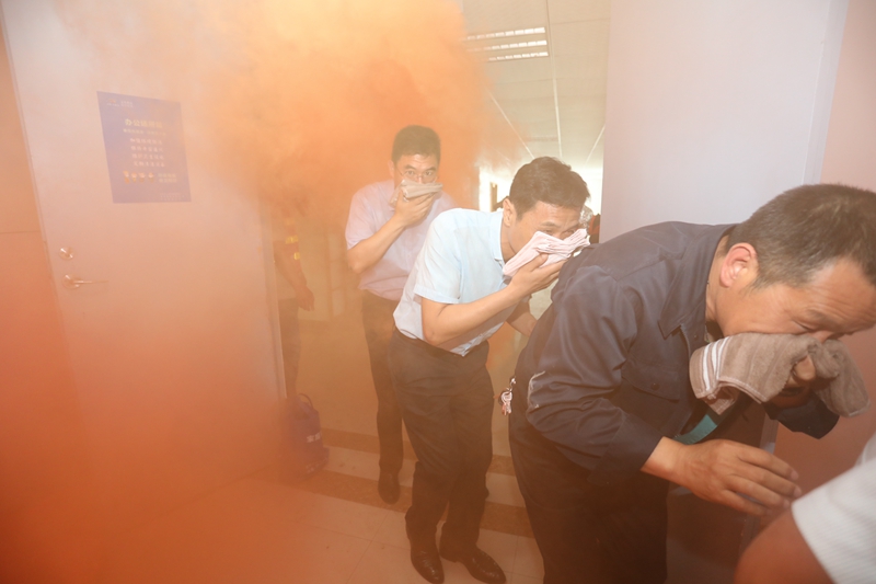 在消防演練現(xiàn)場(chǎng)我們模擬了突發(fā)火災(zāi),受濃煙影響的參培人員進(jìn)行快速有序的疏散逃生。按照董教員的講解要求,大家“三折八疊”毛巾,浸濕后捂住口鼻,俯下身子,肘部依靠著墻壁,一個(gè)跟著一個(gè),在濃煙中疏散撤離。接著演練還進(jìn)行了油盆滅火和高壓水槍使用培訓(xùn)實(shí)操。參演人員嚴(yán)肅認(rèn)真,服從指揮,整個(gè)應(yīng)急疏散演練過程忙而不亂、井然有序。
