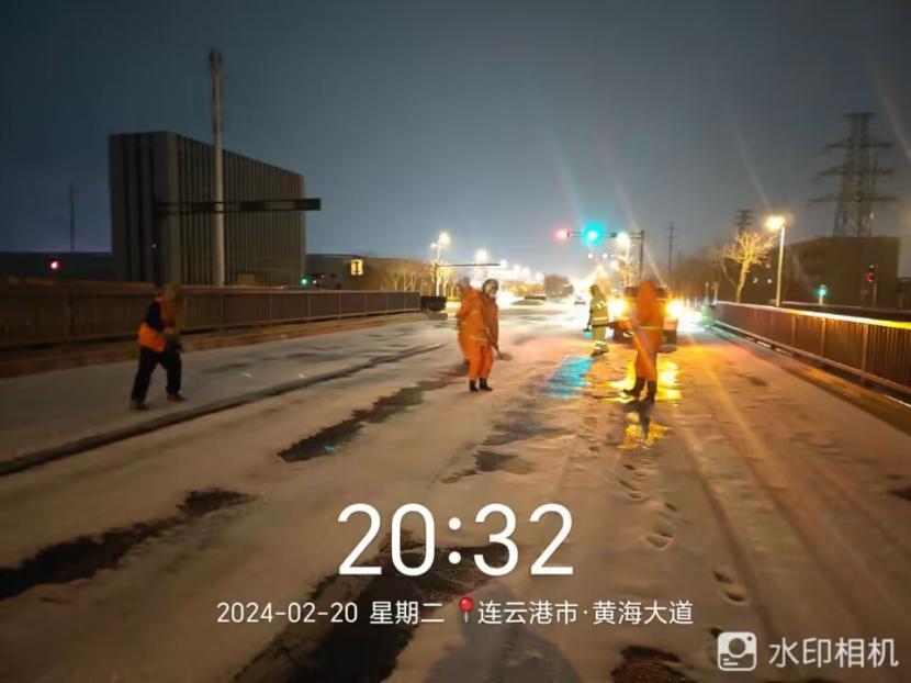 夜晚10點,在黃海大道,支部書記范曉寶親自帶隊,帶領張巖、盛小雷、薛加兵等6名黨員,冒雪奮戰(zhàn)、連續(xù)作業(yè),拋撒融雪劑,進行緊急除雪除冰作業(yè)。