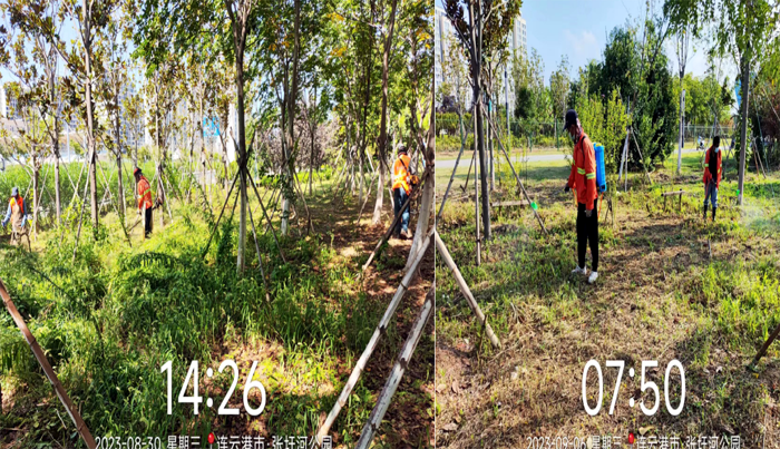 ? ? ? ?工作中,技術(shù)人員李傳武與管養(yǎng)班組長班長田恒亮、協(xié)管員葛承東奮戰(zhàn)在第一線,身先士卒,無懼高溫及蚊蟲叮咬,班組成員在其感染下,步調(diào)一致、步步為營,有序推進(jìn)各項(xiàng)工程進(jìn)度。經(jīng)統(tǒng)計(jì),在張圩港河公園100萬平方米草坪綠化帶上開展各類修剪10次、雜草反復(fù)清理近20次、病蟲害藥物消殺4次、新栽各類苗木600余株、清理枯死樹木300余株、對相關(guān)造型樹進(jìn)行修型。在防汛抗旱維綠工作,采取白天人工澆水搭配晚間滴灌澆水的方法,確保綠綠植健康生長;暴雨后扶正傾倒樹木11余株,積極排澇2次……各項(xiàng)工作數(shù)據(jù)一路“飄紅”。