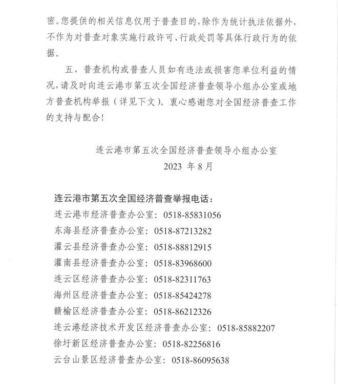按照《全國(guó)經(jīng)濟(jì)普查條例》規(guī)定,國(guó)務(wù)院決定于2023年開(kāi)展第五次全國(guó)經(jīng)濟(jì)普查,為提高經(jīng)濟(jì)普查質(zhì)量,進(jìn)一步推進(jìn)普查工作順利開(kāi)展,公司按照上級(jí)第五次全國(guó)經(jīng)濟(jì)普查宣傳動(dòng)員工作要求,現(xiàn)將《連云港市第五次全國(guó)經(jīng)濟(jì)普查單位告知書(shū)》公示如下: