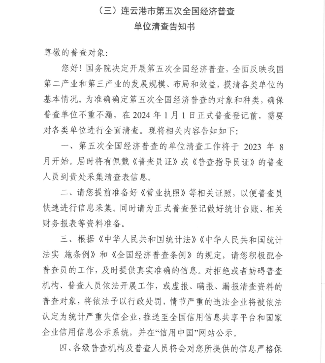 關(guān)于《連云港市第五次全國(guó)經(jīng)濟(jì)普查單位告知書(shū)》的公示